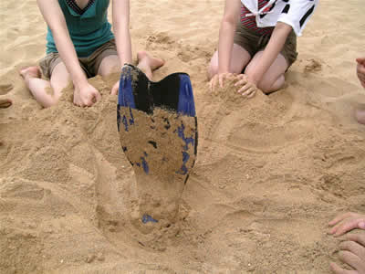 水かきを倒したら、欽ちゃん走りで砂を固めるための水を汲みに行くというバツゲーム。