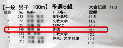 俺、スタートだけは速くて50mまではトップだったんですが、後半でまくられてこの結果。
