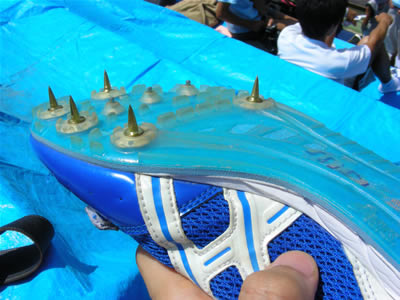 やむを得ずオールウェザートラック専用スパイクに土用ピン装着の暴挙w。