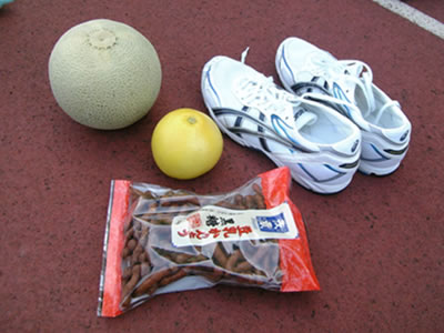 400m区間賞。メロンとグレープフルーツとかりんとう。ついでに前日買ったレースシューズ。