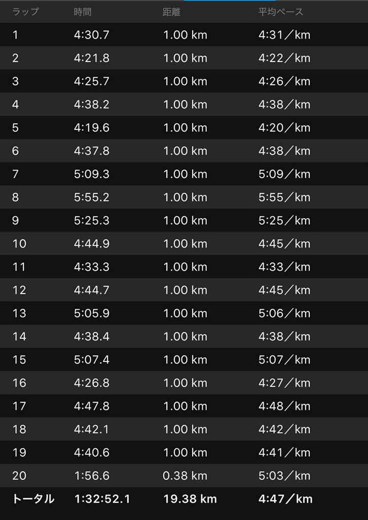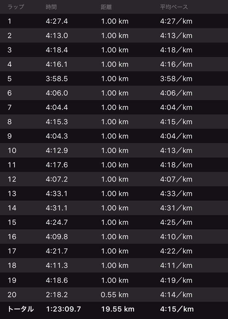 気がつけばペースは4’00/km前後まで上がってそのまま走破。荷物も背負ってるのでだいぶヘロヘロにはなった。