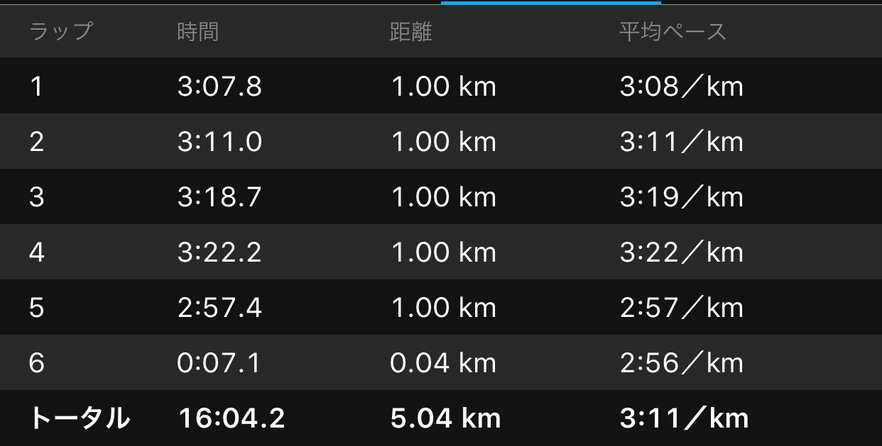 ガーミンだとラスト1kmが2’57なんだけど5.04km計測なので余った40m分の7秒をどこに振り分けたらいいのか??