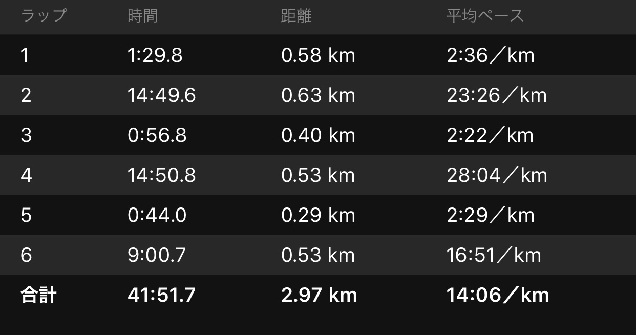 300mはお散歩の方々とぶつかりそうになってスピードだいぶ落としたのでもうちょいタイム出せたかなと。