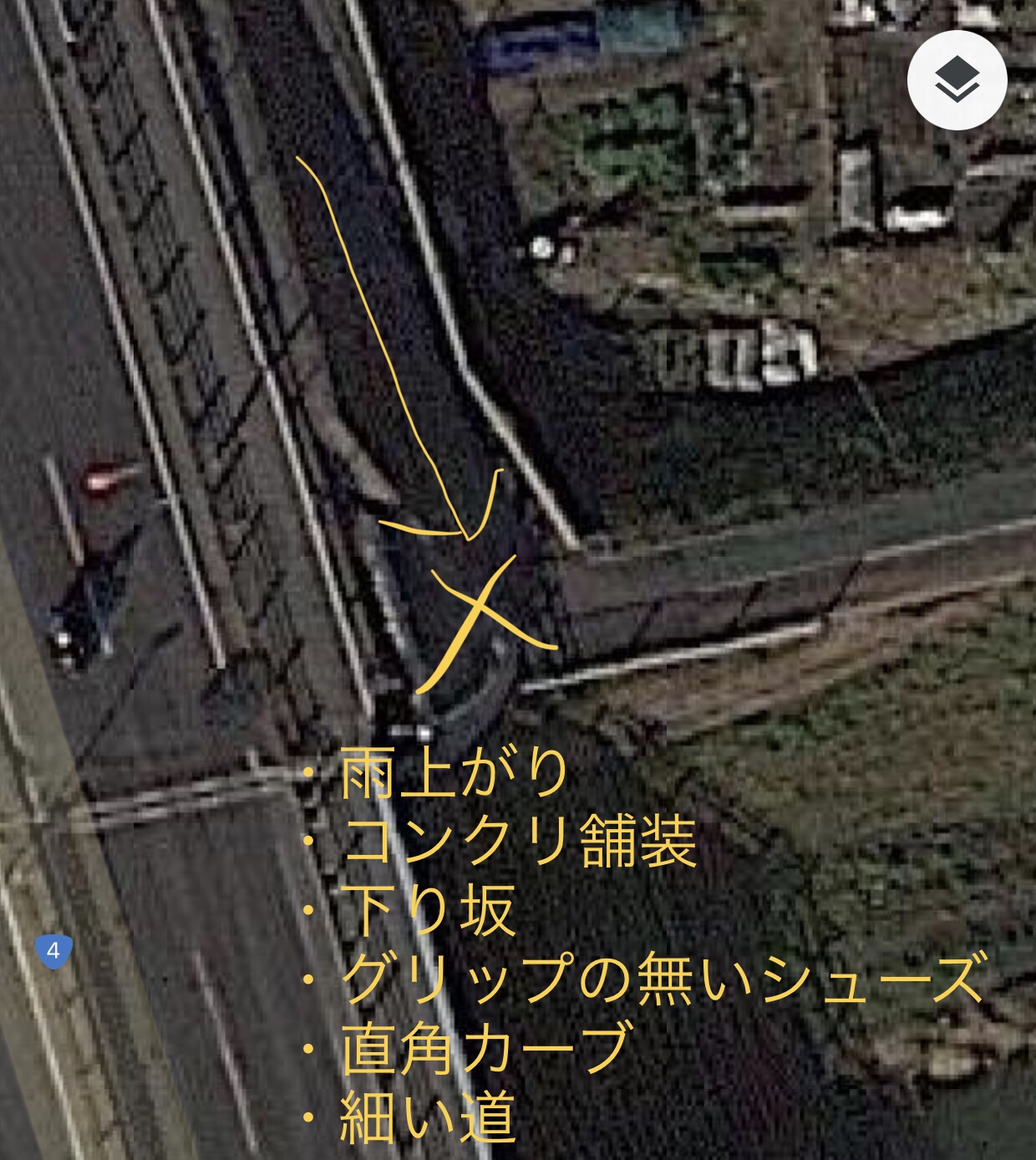 直角カーブは進行方向に対して大きなブレーキをかける。路面が滑ったら、かかるはずのブレーキがかからない。