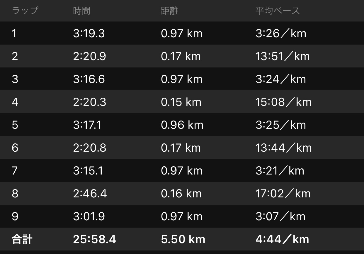 本練習は1km地点までだけど内周走ってるので若干短い。サシコミを恐れて安全運転。最後だけ頑張った。突っ込んでこなせなくなることが多いのでタイムはどうあれやりきることも大事かなと。