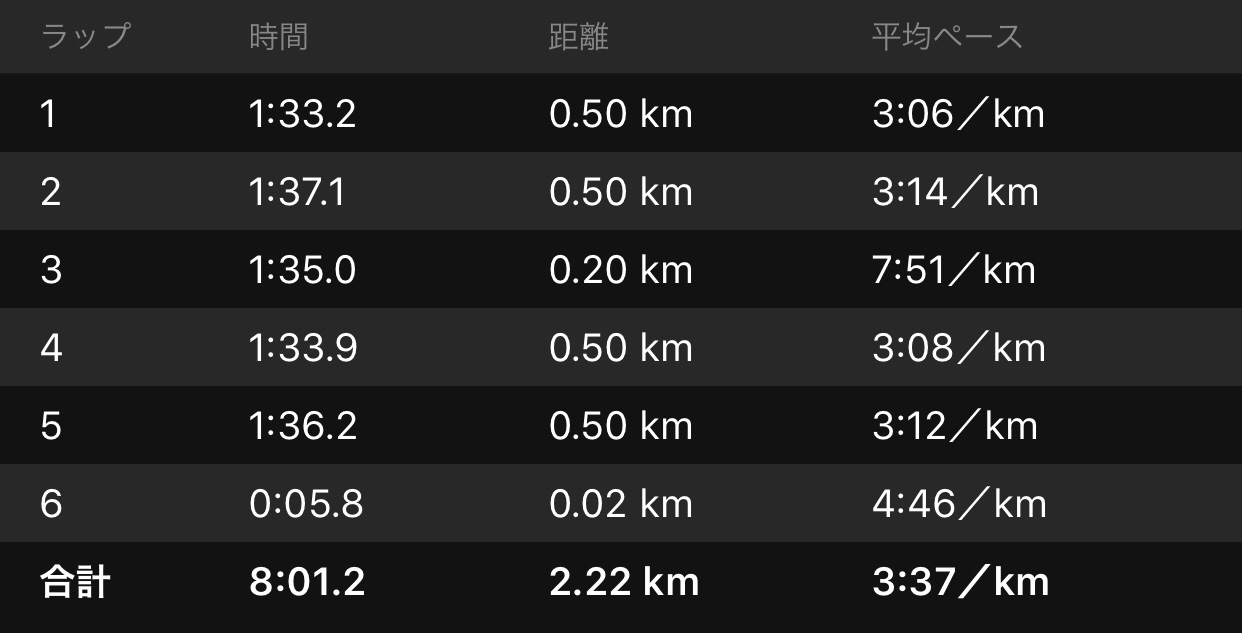 たぶんあと160m長くてもスパートのペースは維持できていた感覚はある。何故その前に3’32かかるのかは謎/(^o^)\