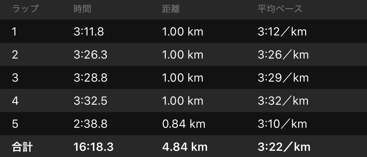 5kmでラップ3’30オーバーはナシにしたいのだけど。。。