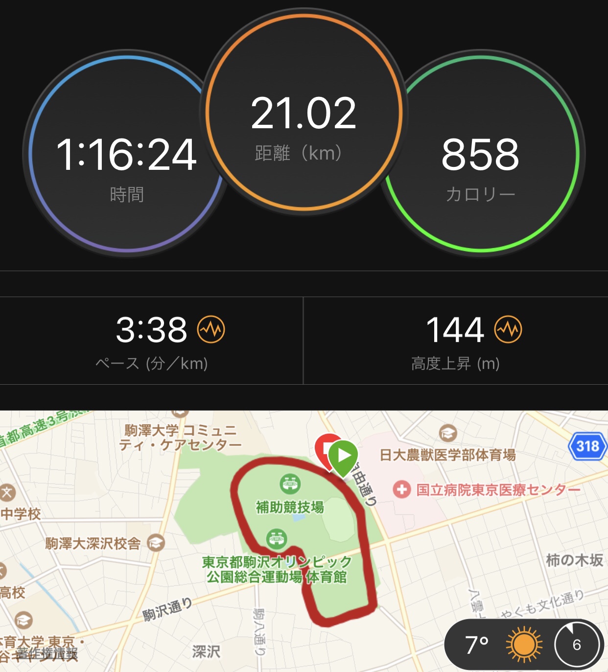 小池さん、飯島さんにお誘いいただいて駒沢公園で30km走。ペース設定は3’40/km。