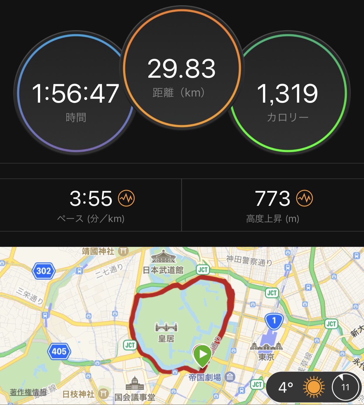 ともかく、2週間前は3’40を切るラップでブン回すも21kmでぶっ潰れて終了した30km、無事に完走できたのでよし\(^o^)/