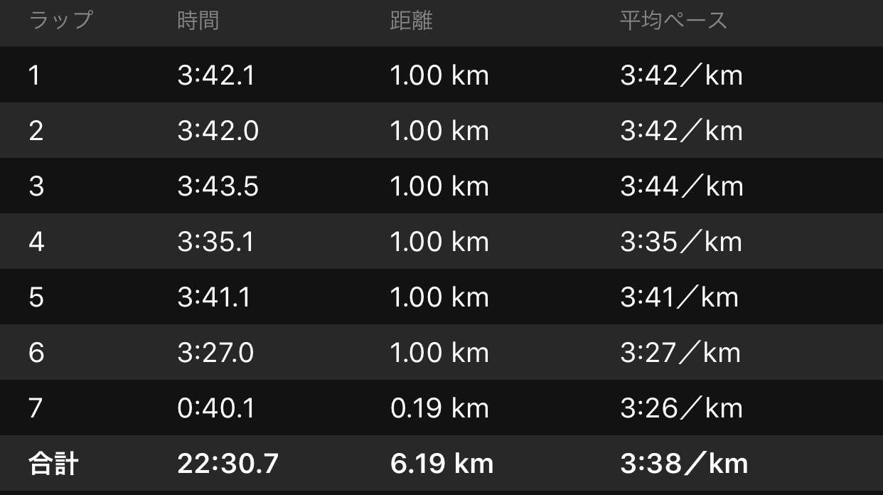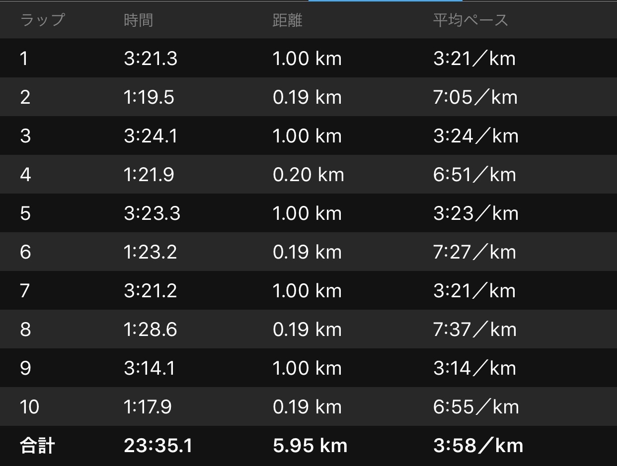 あまり後先考えずにキッチリこなす。5本ちゃんとやり切れたけど3’20切れないってのは厳しい結果である。。。