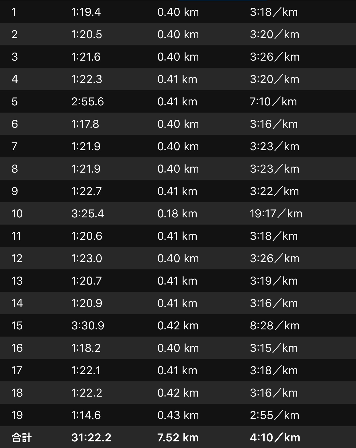 3’20/kmペースで押し切りたかったけど1周80″が守れない。すでに1本目で腹痛がきてて2本目終了時にピットイン。