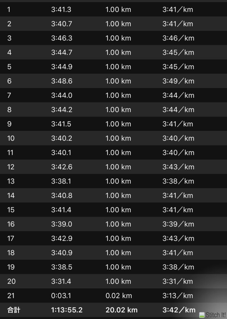 ということで序盤こそ鈍かったのでアベレージは3’42だけどおおむねターゲットタイムのレースペースで20kmまでは押せた。