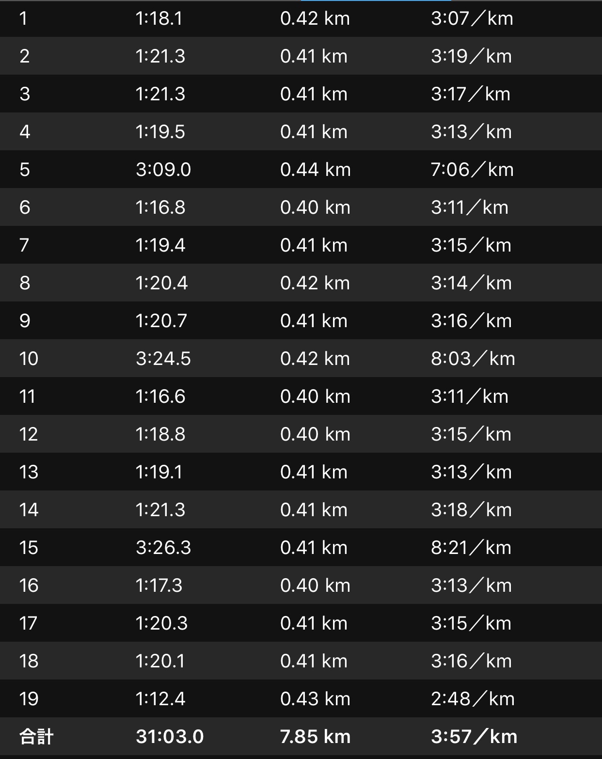 調整期間に入って3日ぐらいゆるjogとOFFで過ごしたら疲れが抜けてきたか。やっと1600m×4を3’20/km以内でできた。気温が高めなのもあるかなー。