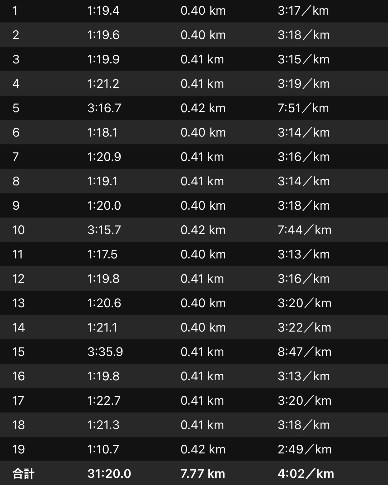 ラスト1本のラスト1周は70″で帰ってこれてるのはこのメニュー初めてから過去最高だけどそれまでに弱気な82″とか81″を叩いてトータル5’13なのであまり価値は無いかな。