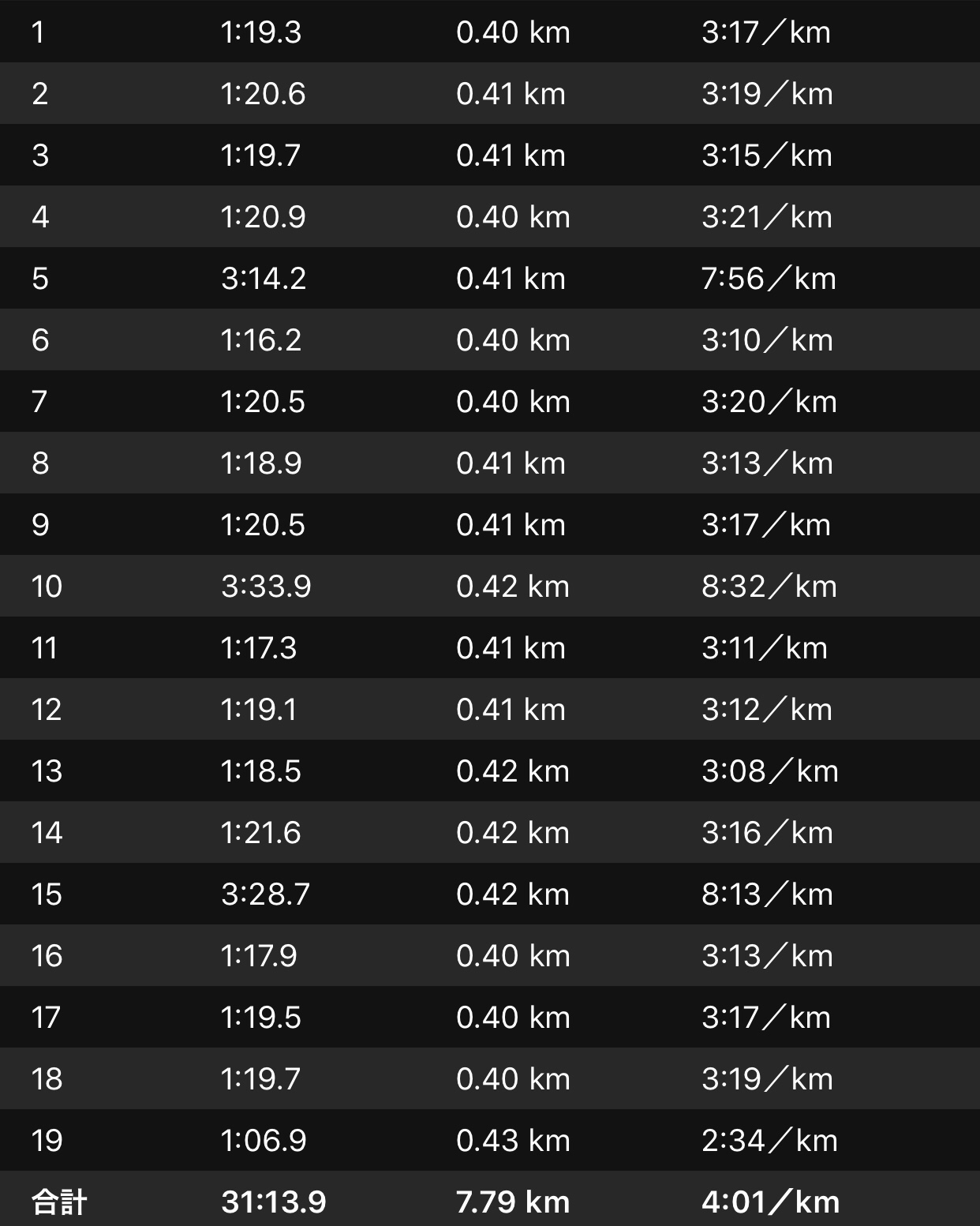 いつもこの後5000mちょいをレースペース想定(3’40/km前後)でやるのだけど、疲れ切ってしまって今回は全くペースが上がらない。