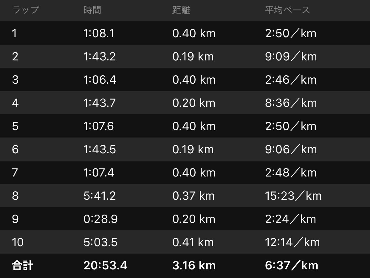 400mは少し速すぎた。6本やろうと思ったけど4本でフォーム維持が限界だったので終了。