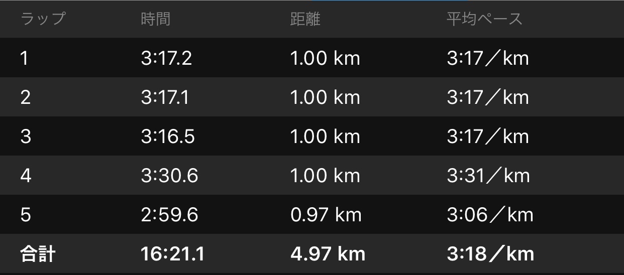 ジリジリと前2人に離されて、ラストで1人を詰めるも追いつかずそのまま3位でゴール。1位の人は16’11。ラスト1km切って10秒離されるのはちょっと力の差があるなあ。並走してて3kmすぎても息が切れてなかったので予感は当たってた。