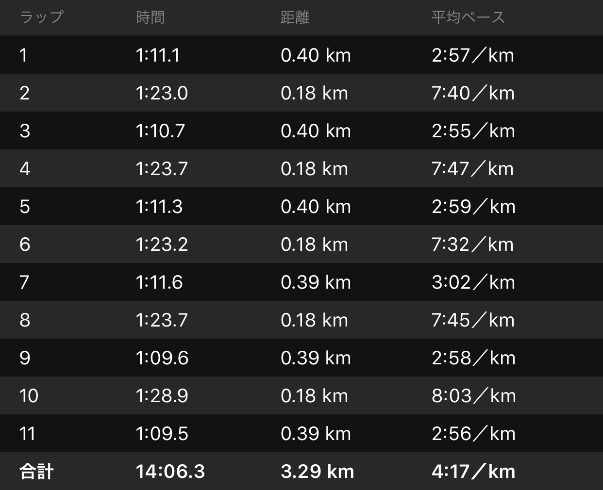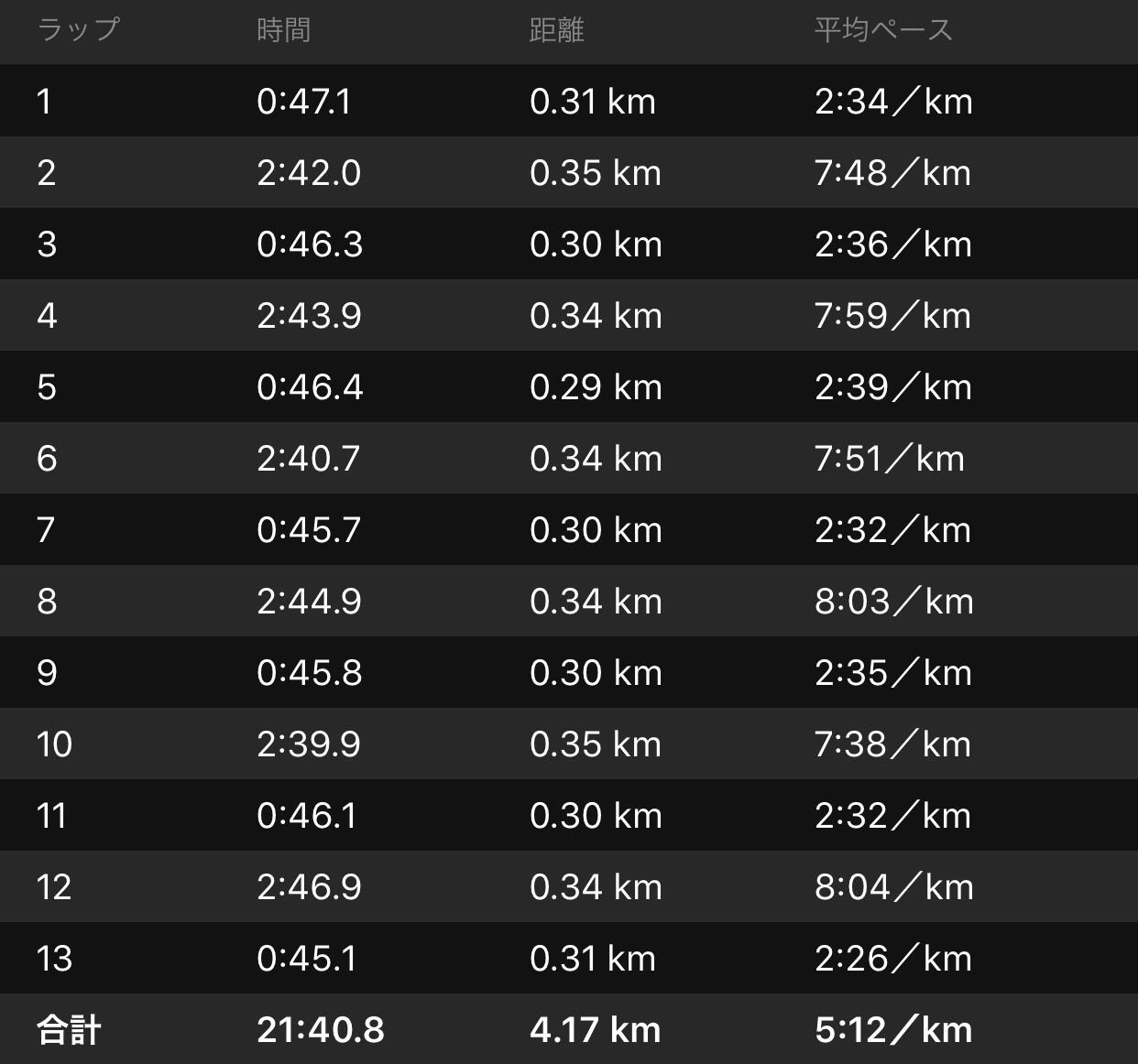 今期、中距離向けの練習を始めてから初の300m×7本。いつもは5本で終わるし、7本やったときも5本目以降のrestを歩きにして疾走区間も47″〜48″かけてた。
