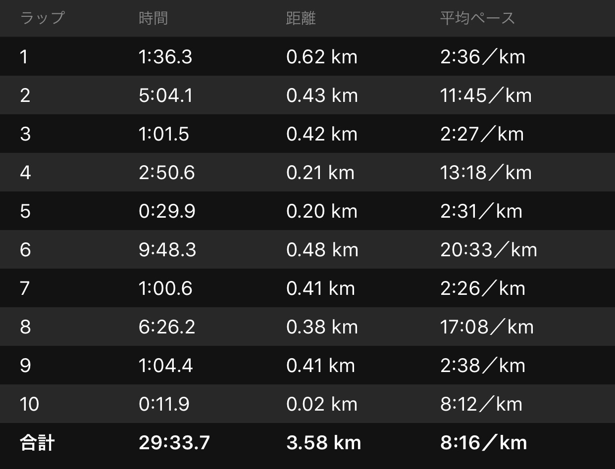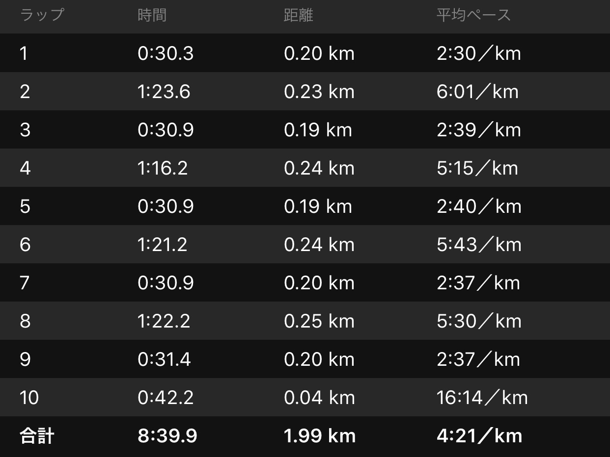 メニューは基本すべてタクヤにお任せしておっさんは後ろからつかせてもらう。ペース配分が凄くうまくて、最初は遅すぎるような感覚なんだけどジワジワと上げていくスタイルで、結果を見るとイーブン。最高でしたね。