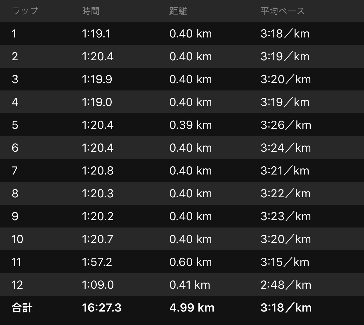 他のランナーを一切気にせず、ずっと1人で走ったイメージ。ラスト2周だけ押し忘れたけどペースは若干上がったぐらいでほぼ変わらず。