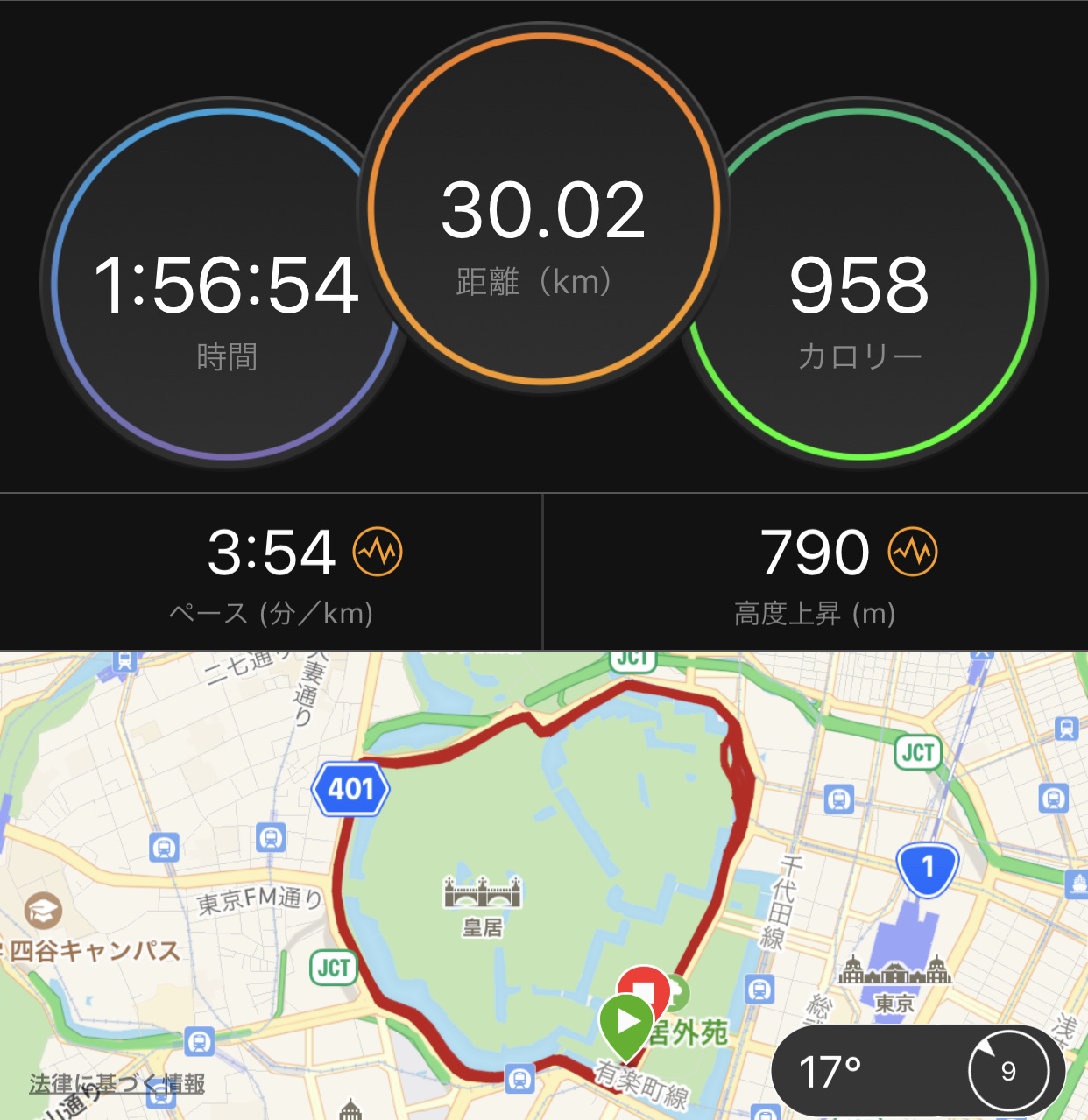10/14 皇居30km 1:56’53 3’54/km