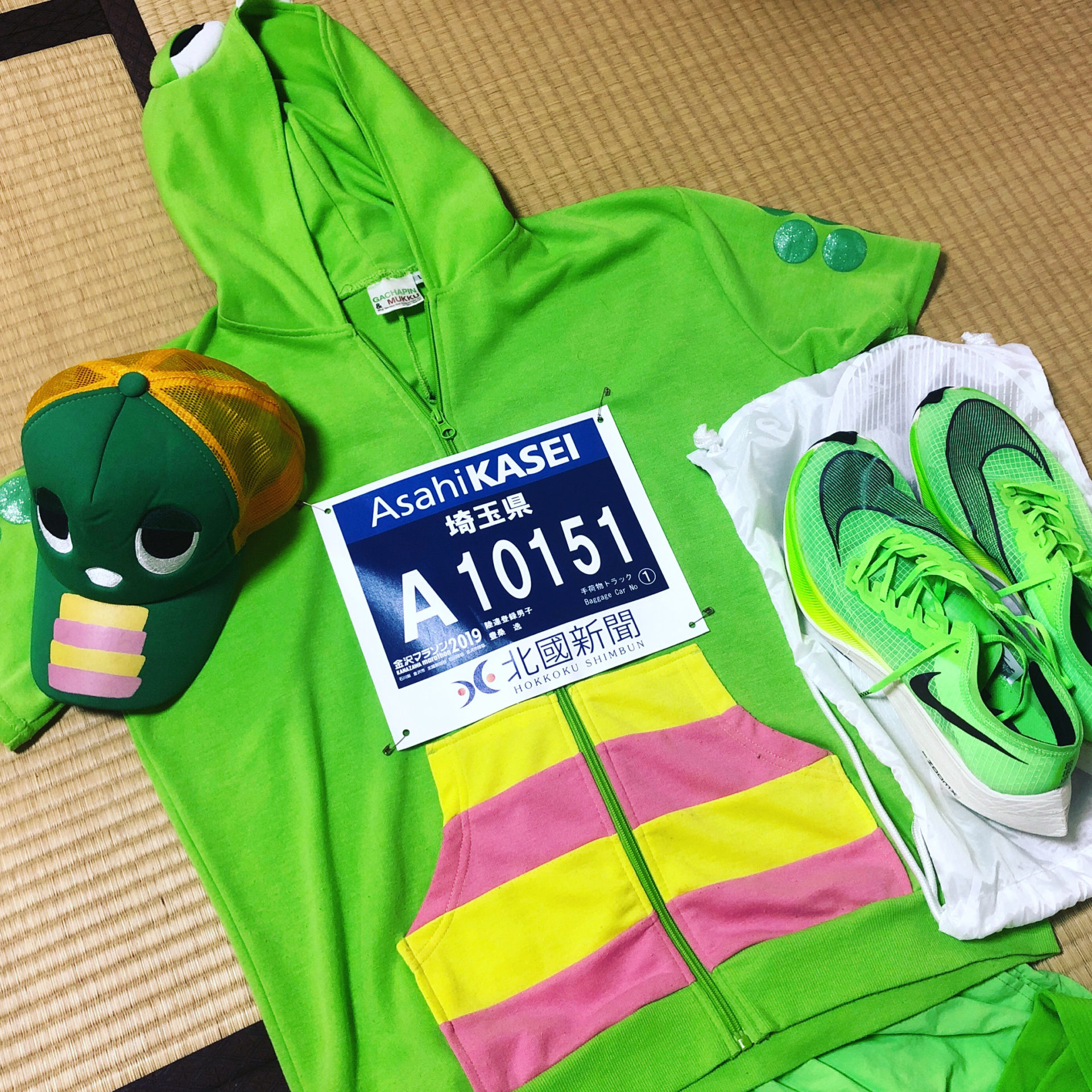 流れに乗ったら予定より速くて、入りの5km 18’43はやりすぎた。やりすぎてるのにこんなカッコしてるもんだから沿道に手を振りまくりハイタッチしまくり、5kmで既に息切れの兆候が出てきて必死に抑えた。