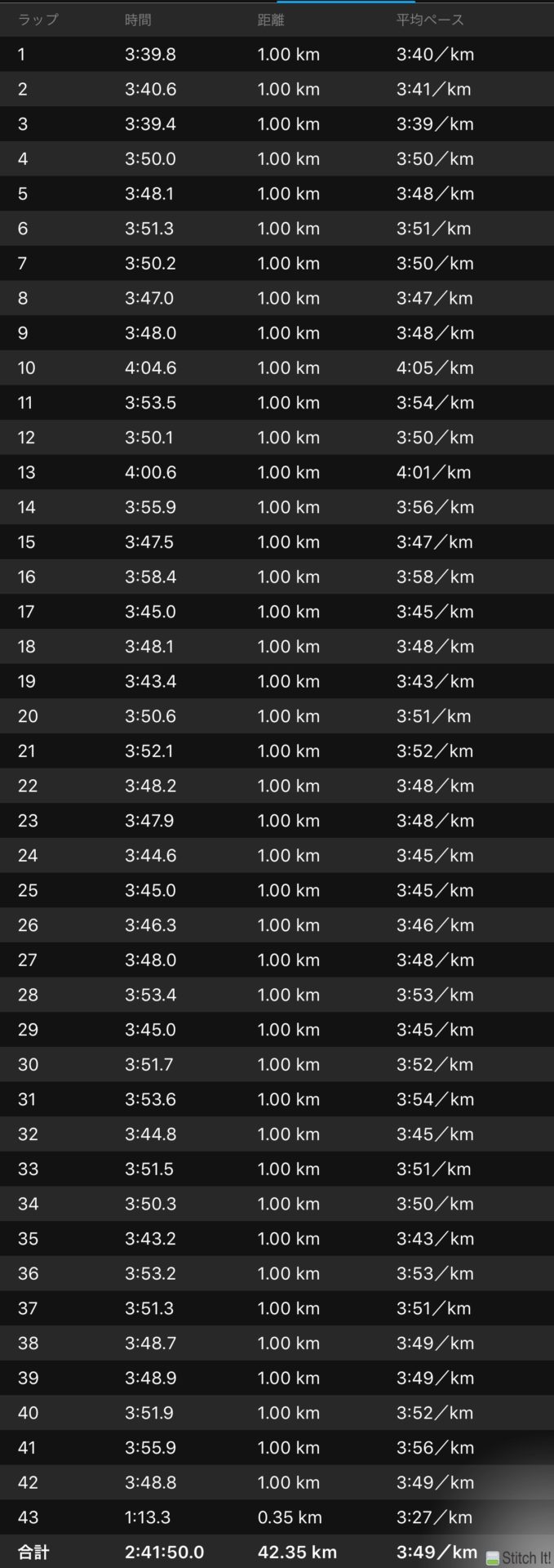 このあたりが反省点ですかねー。前後半の差が約1分。2:35切りをするならこのスピード帯ならネガティブスプリットでいきたいところだったけど、やはり入りの5kmは失敗だったよねえ/(^o^)\