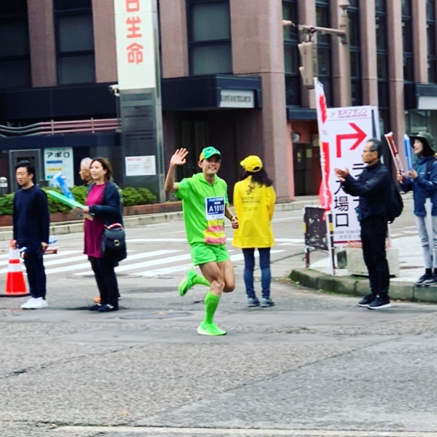 流れに乗ったら予定より速くて、入りの5km 18’43はやりすぎた。やりすぎてるのにこんなカッコしてるもんだから沿道に手を振りまくりハイタッチしまくり、5kmで既に息切れの兆候が出てきて必死に抑えた。