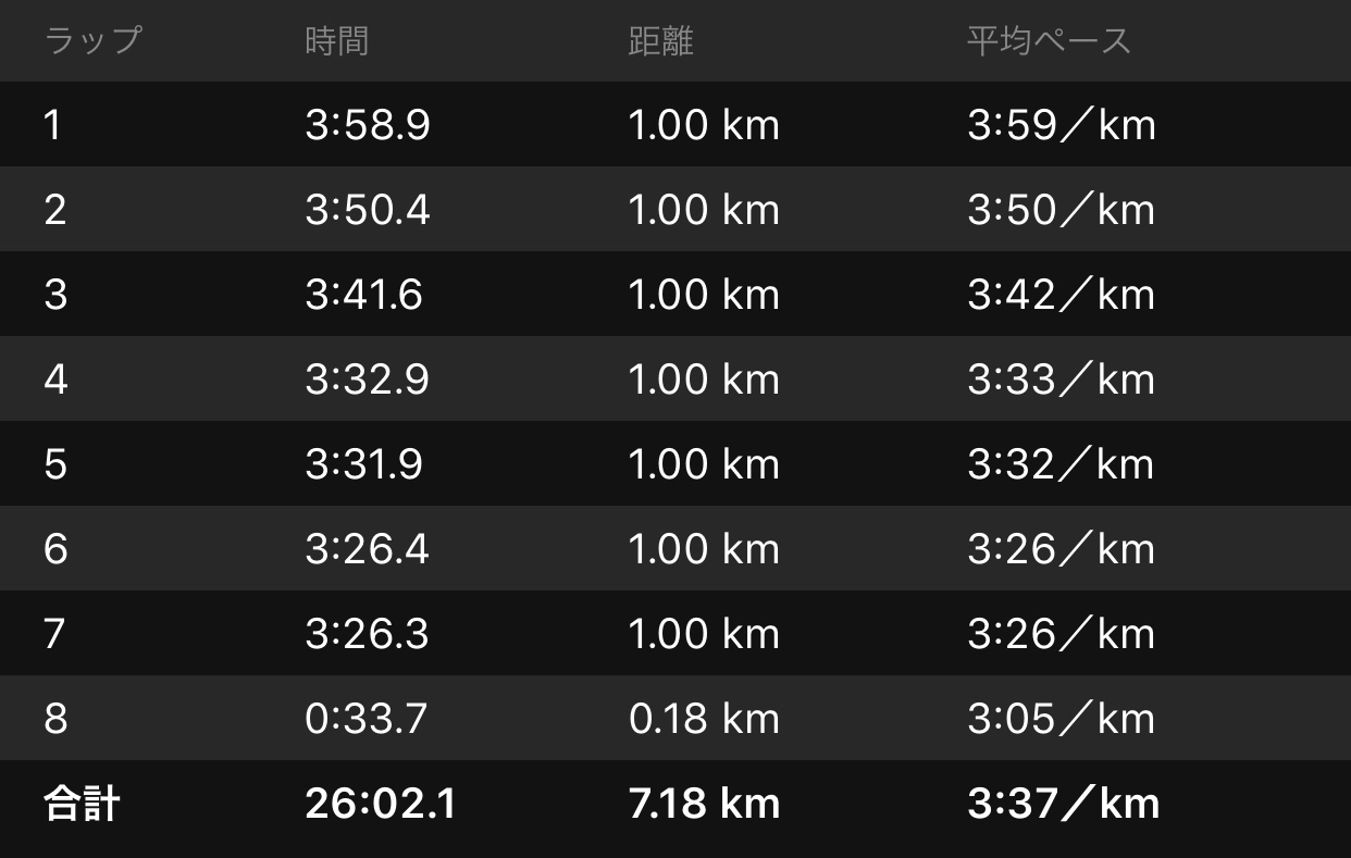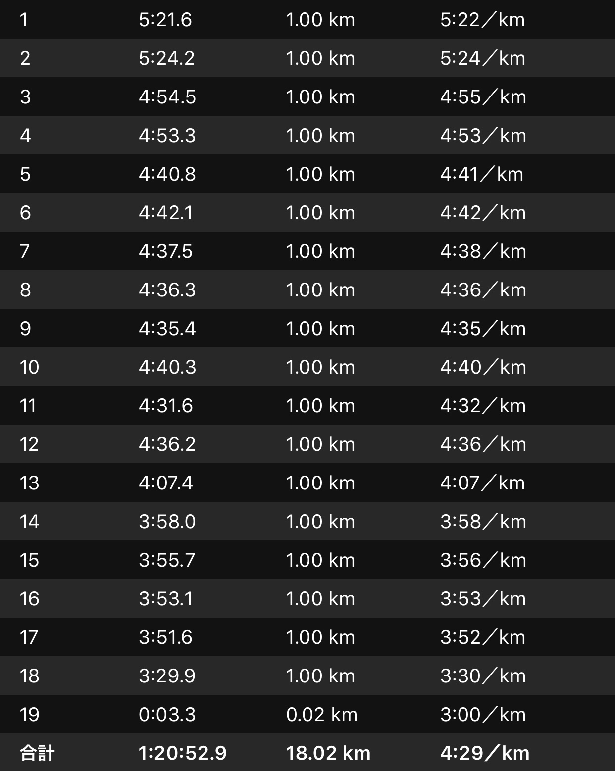 現地の空気を読んでTシャツ+ヴェイパーフライFKにて出走。1人が飛び出したのを放置してゆっくり入ってビルドアップ。ラスト1周でついてきた1人が前に出てきたけどスパートする力は残ってなかったようで再度抜く。