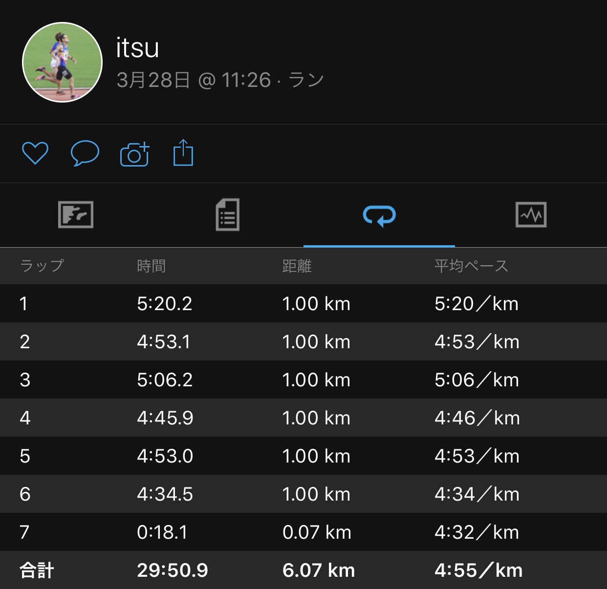 6km 29’50 4’55/km ペガサス35
