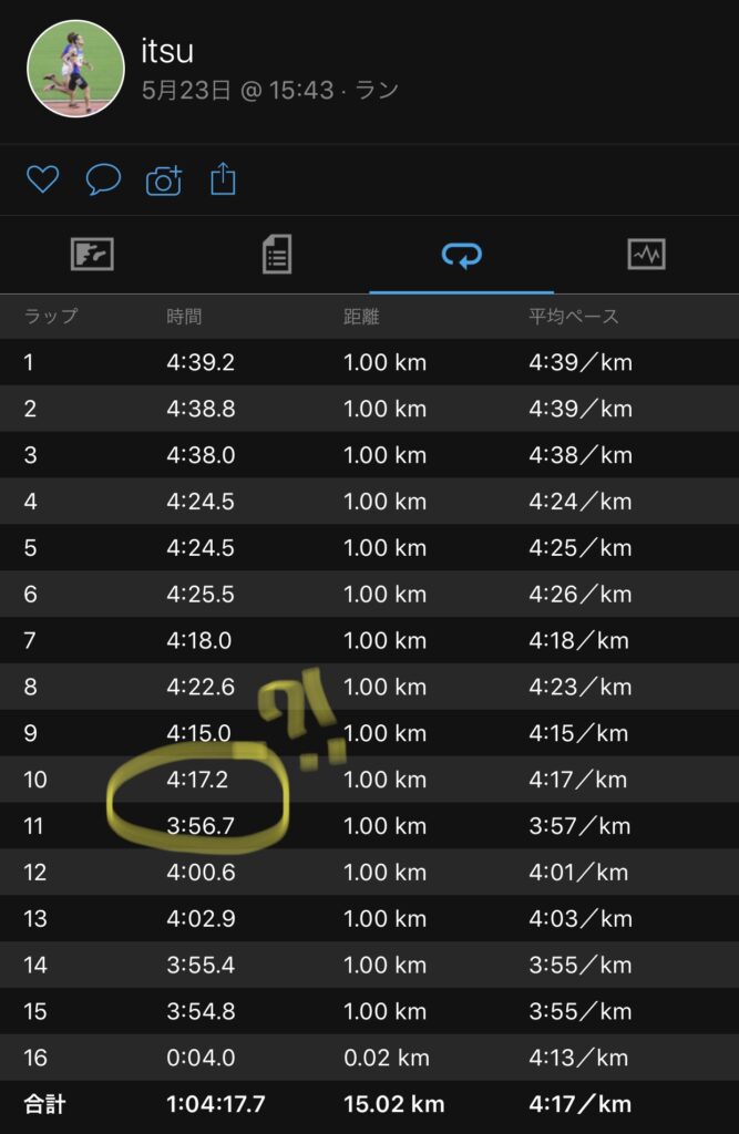 体の出力的にはずっと一定で押していたはずなのだが10km~11kmの区間で何かが起きた。突然ラップが20秒上がったのでGARMIN先生がGPS見失ったんだと思ってたんだけど、そのまま走っててもラップがあんまり変わらない。