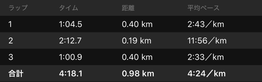 400mが60″で走れたけど、若干調子こいたのでもう少し抑えよう。2本目も64″でよかった。