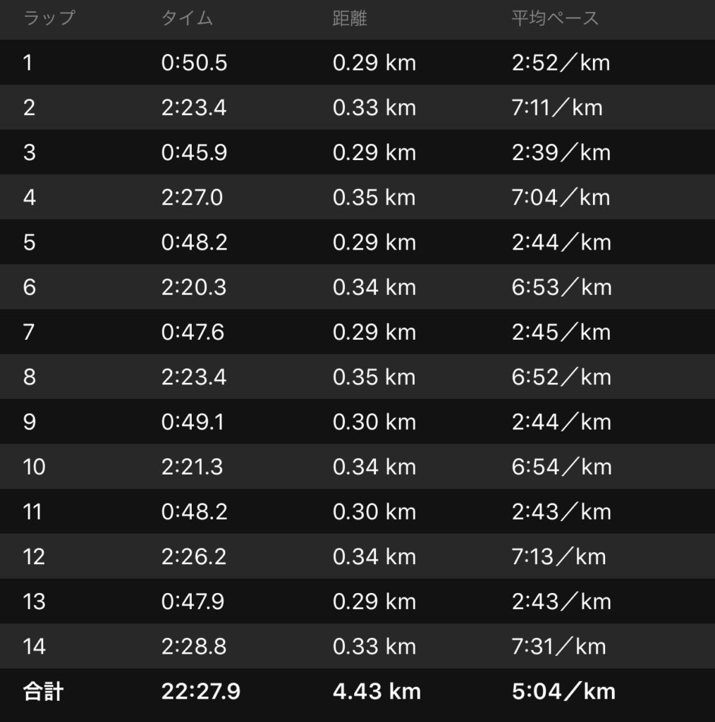 一応2’30以内は守れてるからいいけど、リカバリー300mで30秒違うだけで、レペ寄りかインターバル寄りか、効果が変わりそうな気がするなー。
