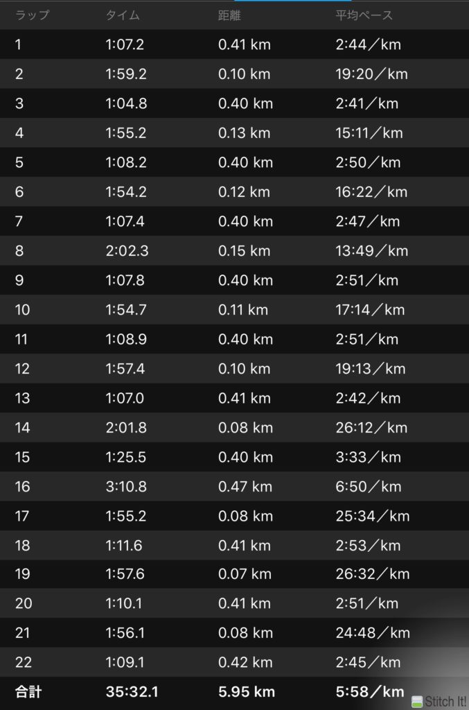 設定が守れない状態になったけど、タイムを落としてでも10本やり切ろうと思ったので9本目を流す感じにして85″で走ったが、このとき7本目だと思っていたので既に前半の時点で数が飛んでいる。