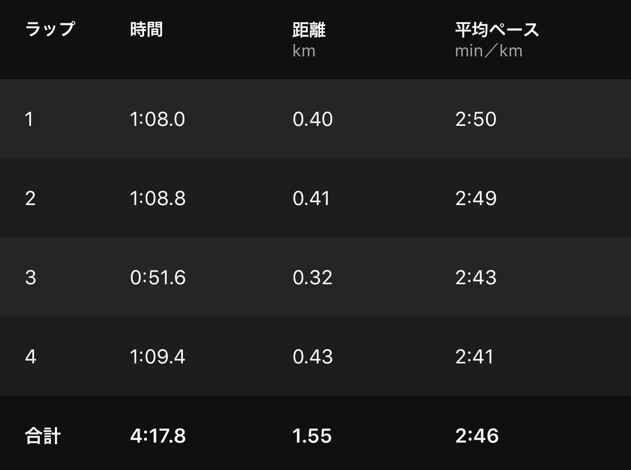 1000m通過が2’51ぐらい。ラスト300mは52″1だった。鐘が鳴る前に力が尽きかけているのは感じていたけどアクセルは踏むしかなかったw ゴール手前100mは見事にピヨって為す術もなく3位を献上。