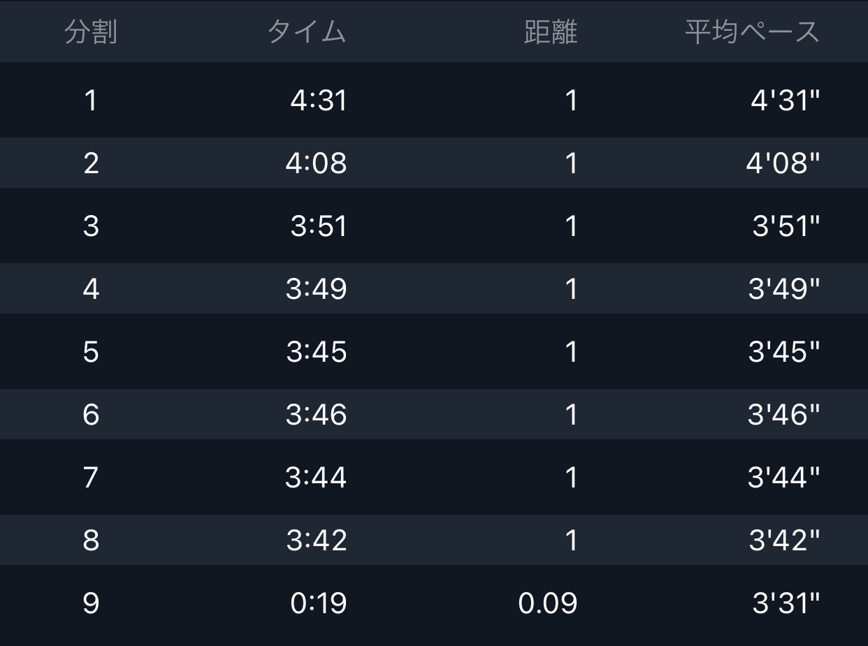 ペーランは10km行きたかったけど、右脚の大腿四頭筋がバキバキになってきたのとサシコミも始まったので抵抗せず撤退。まあ余裕は無いってことよな。