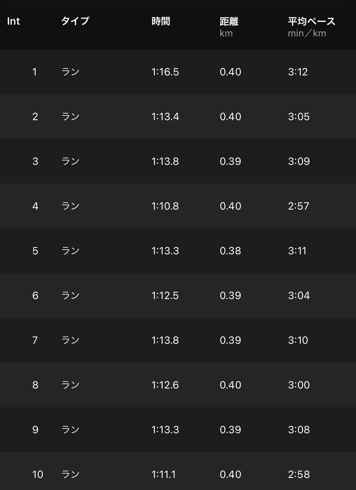 3本目ぐらいまでリカバリーでかなり余裕が持てるぐらいまでになれてないと10本やりきれない。とにかく安全に。