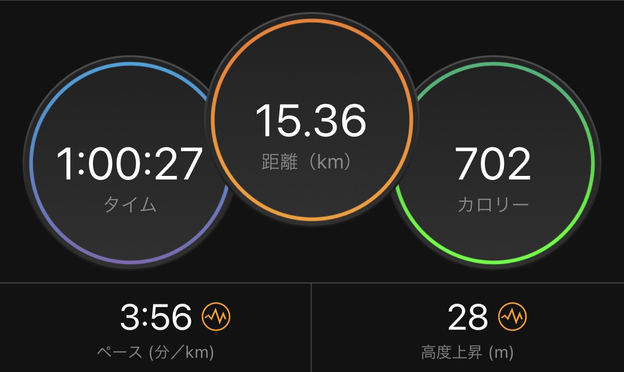 15.4km 1:00’27 3’56/km(4’22→3’44)