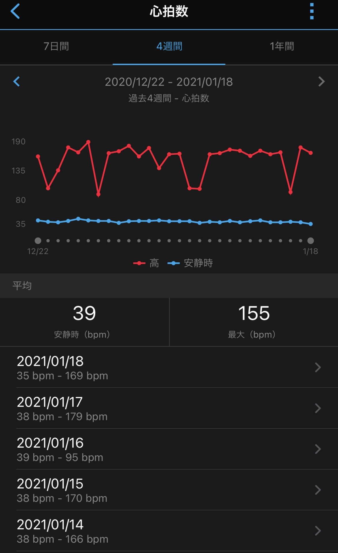 スタート当初42〜45あたりだったのが常に40を切るぐらいになってきた。疲労を溜めずに心肺機能が強化できてきたか?