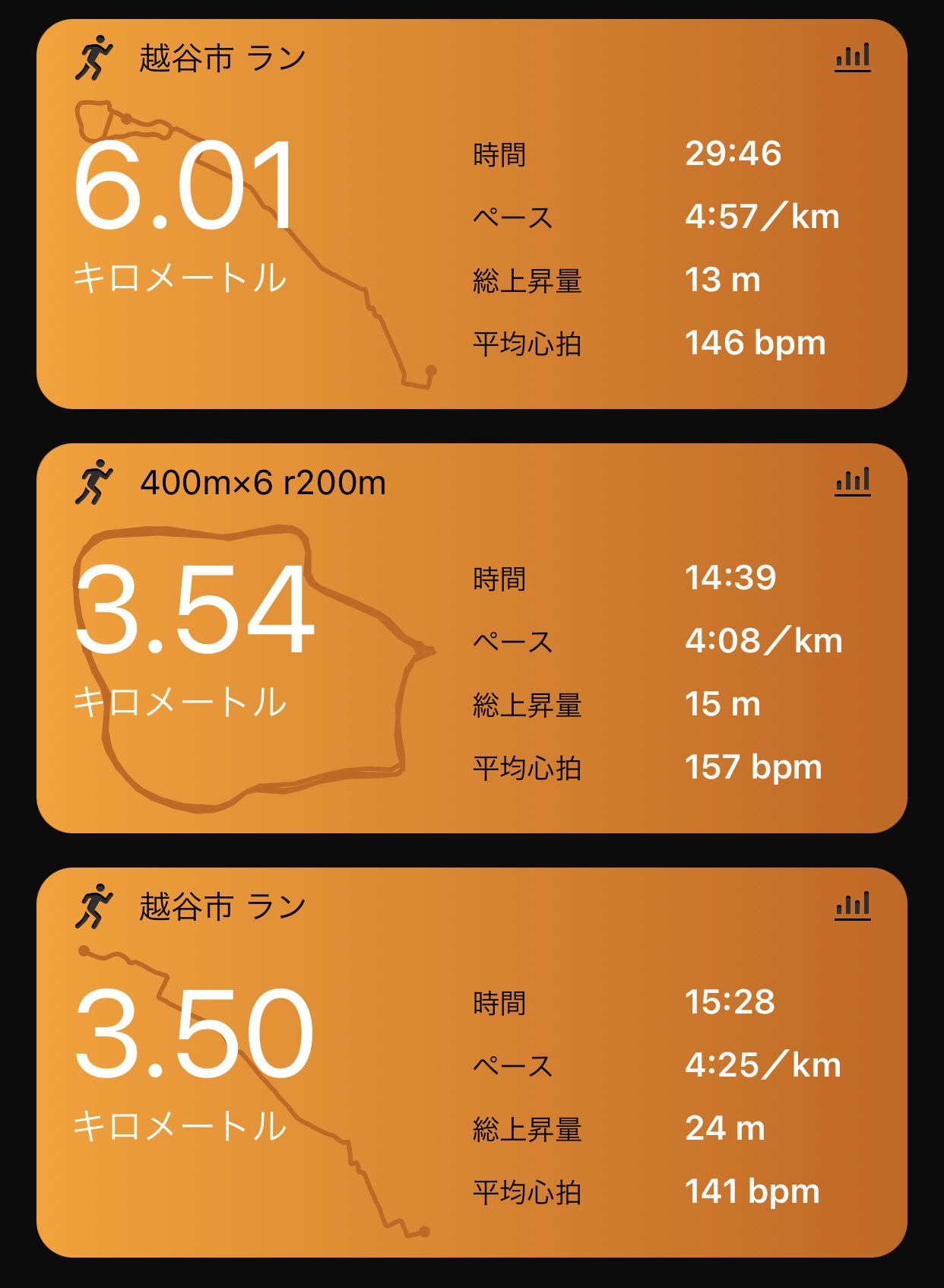 あと1本同じペースでできるかどうか、という余力を残して終えたけど、9/6にやったときよりも1〜2秒アベレージが良かった。