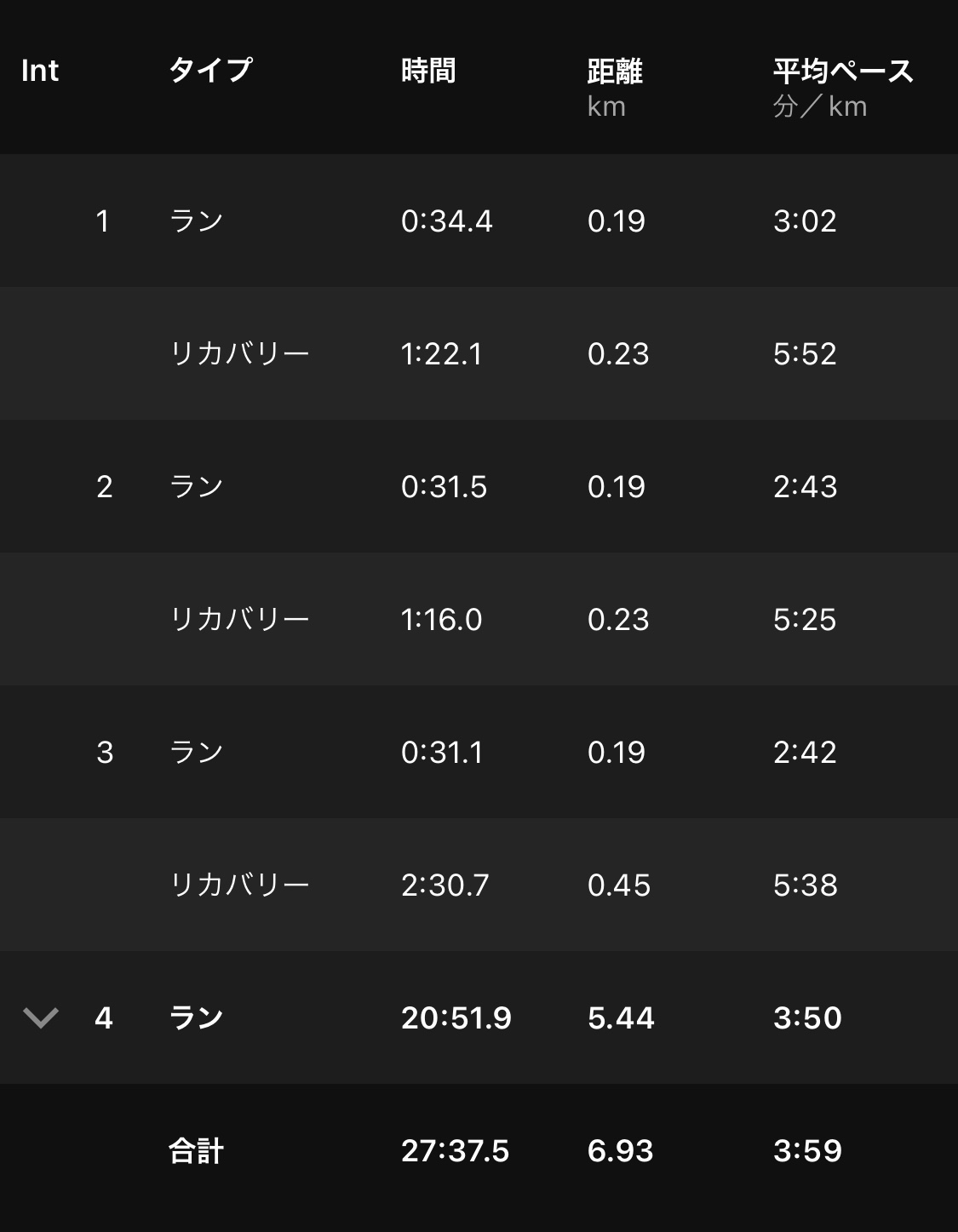 200m×3の直後に5.4kmペーラン。3’50/kmだけどかなーりキツい。