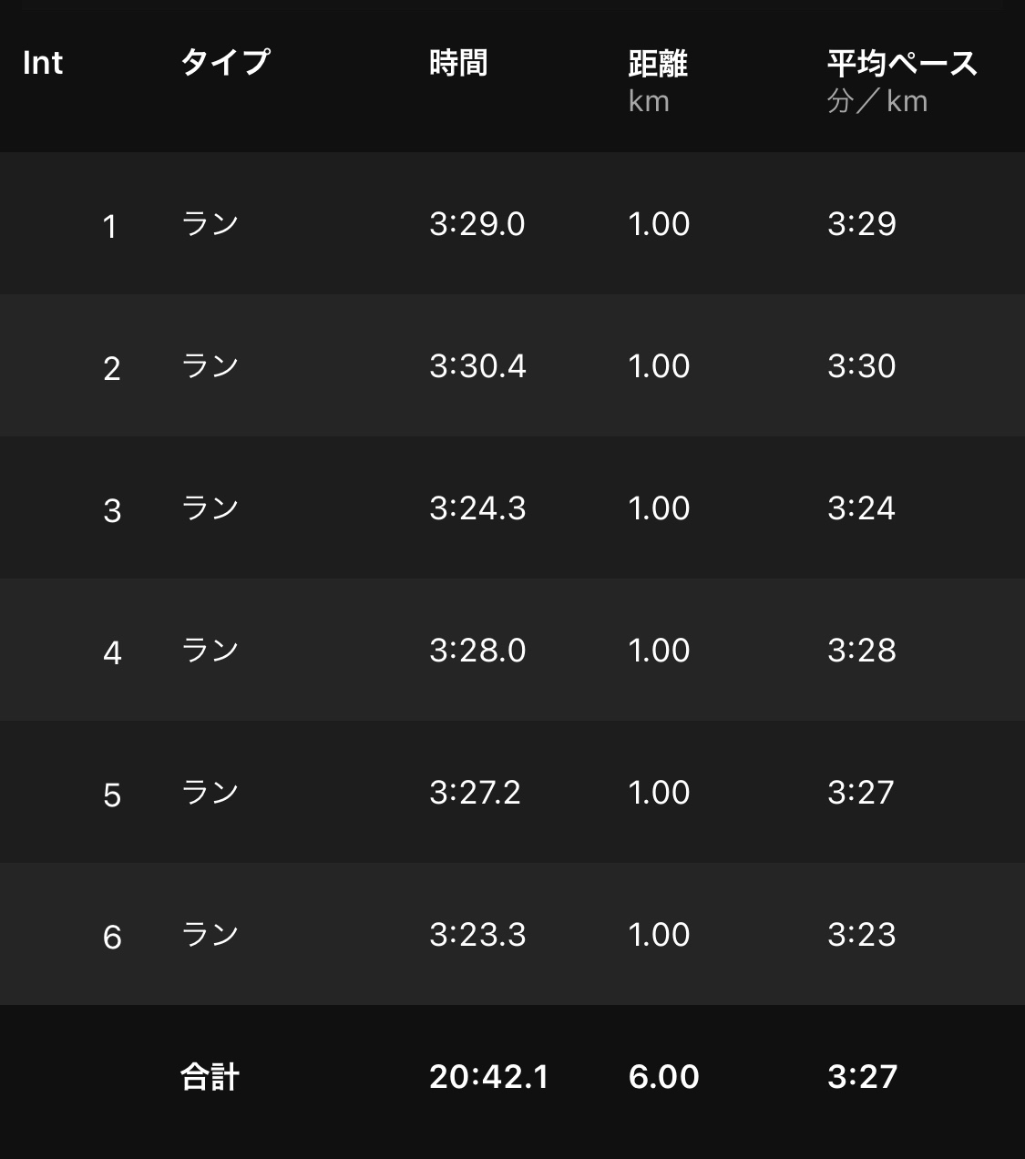 本当は8本やるつもりだったけど、どう考えてももたない。3’30超えるぐらいのペースでやらないと無理っぽい。