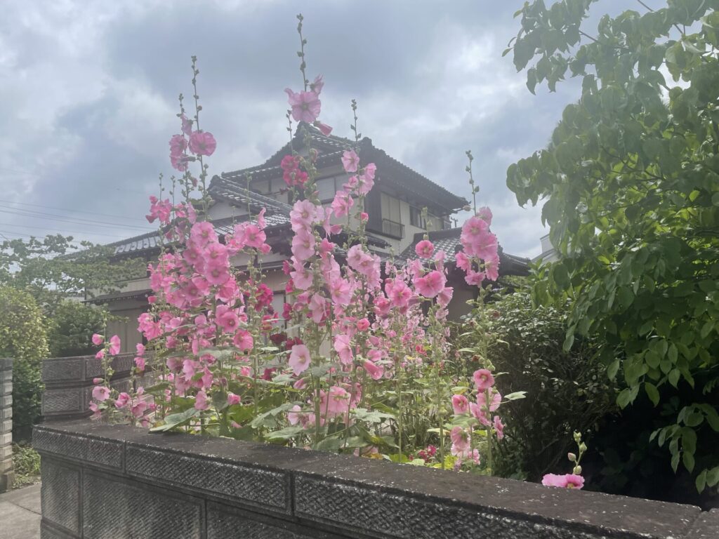 家の近くの用水路沿いで、アスファルトの隙間からたくましく生えるタチアオイ。