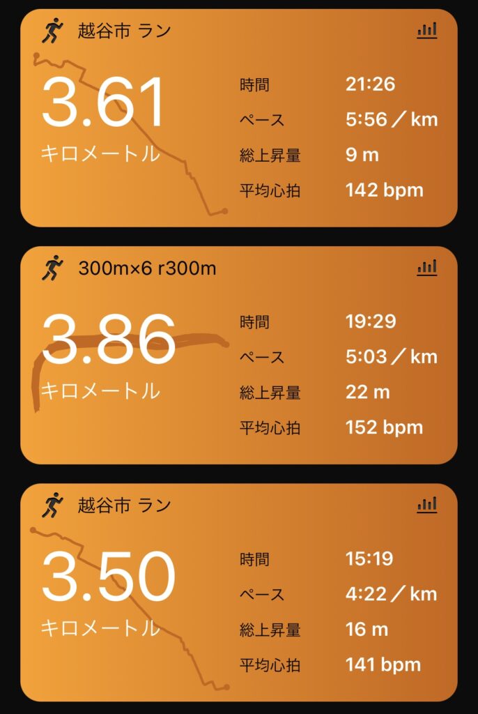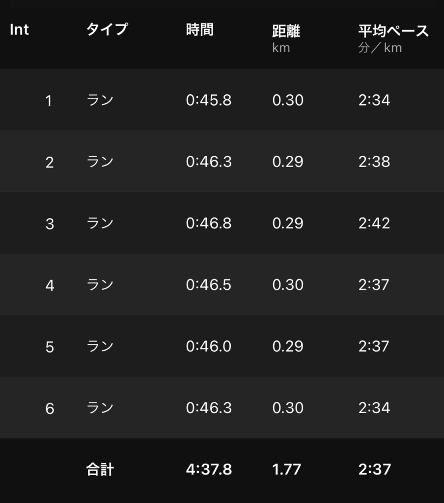 だいぶ久々の300mなので設定は48″切るぐらいで7本いけたらいいかなと思ってたら、しょっぱなから45″台で走ってしまって5本以内に打ち上がる予感がめちゃくちゃしたw