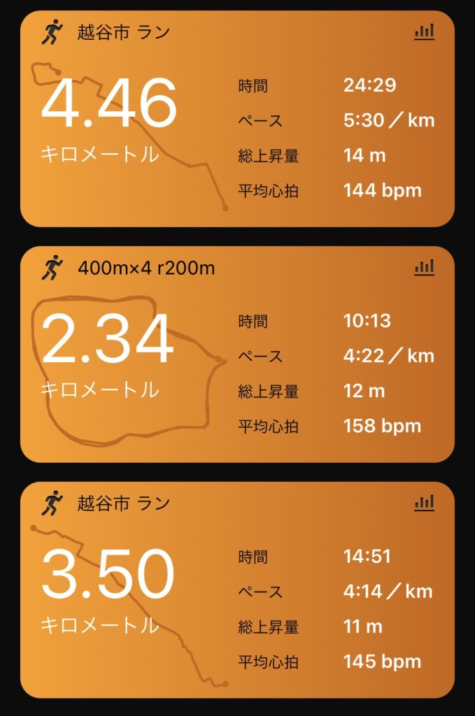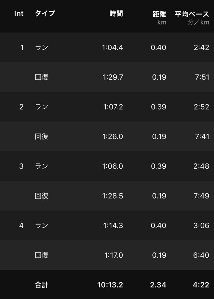 3日後、どれぐらいで走れるのか全くわからんけど、目標4’15だからとりあえず1周68″を意識していく。