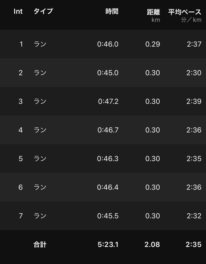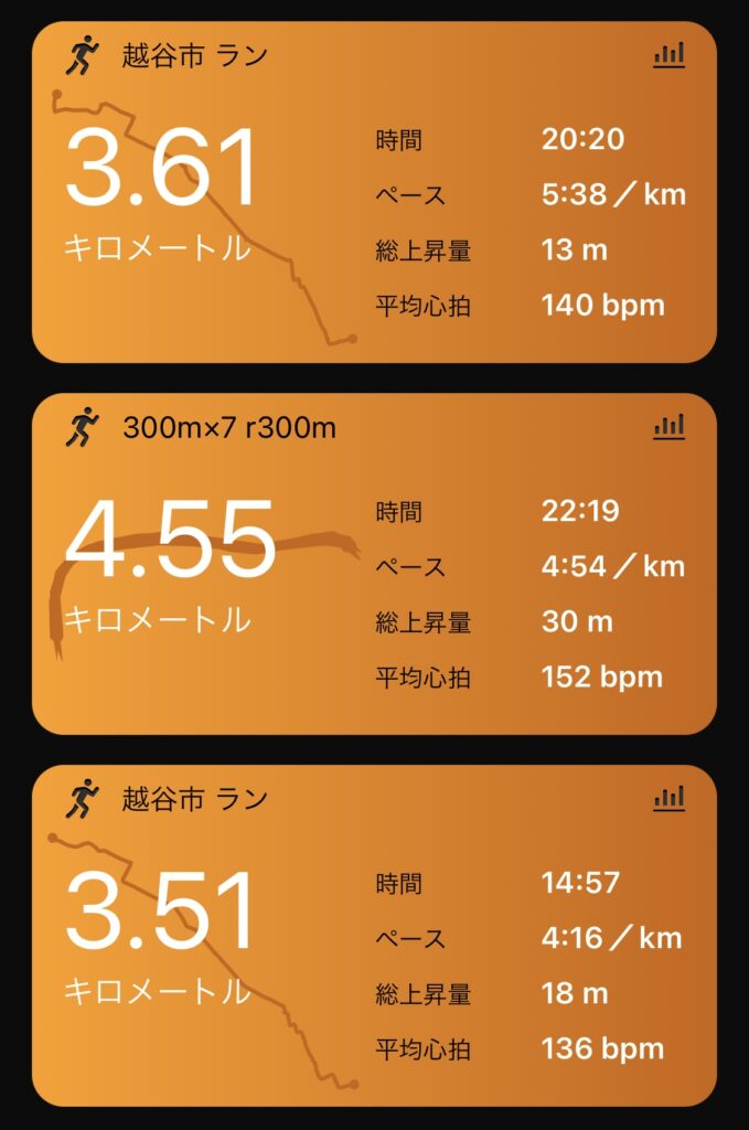 巡航の感覚であと1秒ぐらい速く(45″前半)走れると、1500mの4’10切りが見えてくるような気がする。