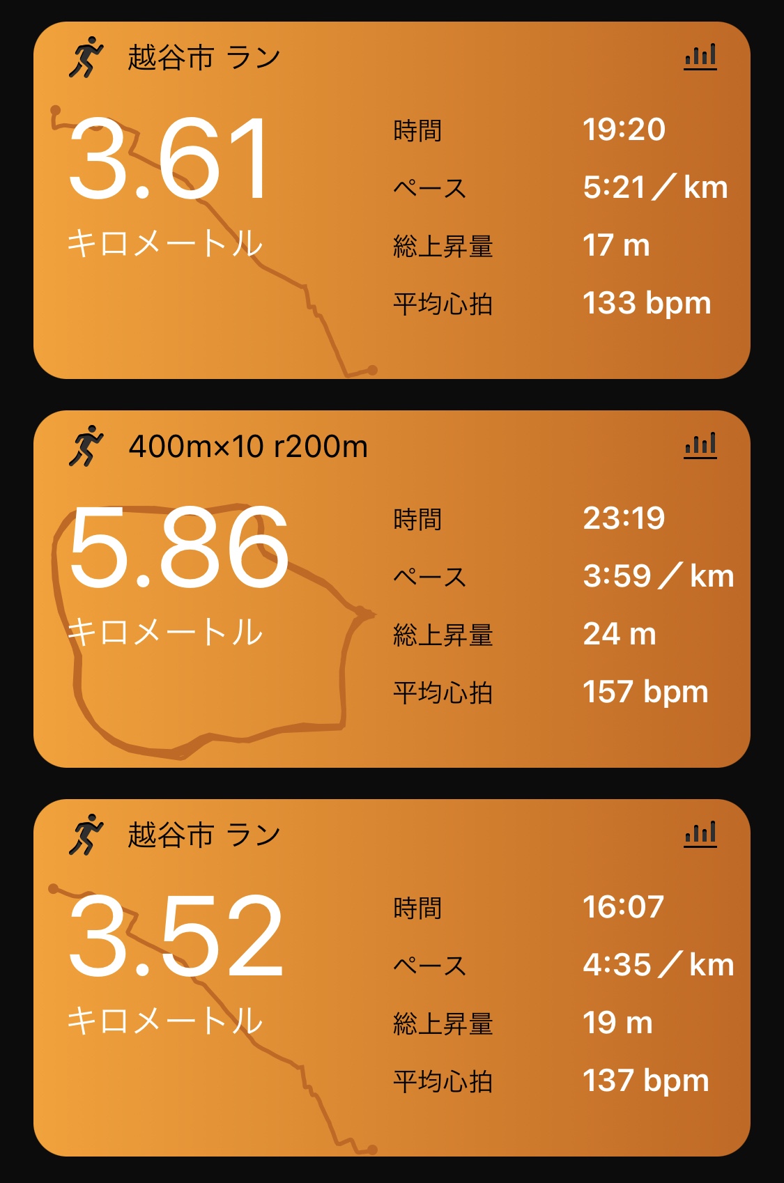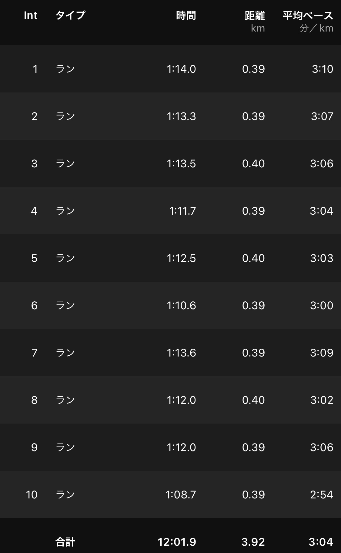 2日前から連続で15km走ったのと、前日にケトルベルのブルガリアンスクワットをキメて股関節のダル重さがあったけど、とにかく頑張らずに終えられる力感でスタート。ラスト1本はちょっと上げてしまったけど、ヒザに手をつくことなく終えられた。