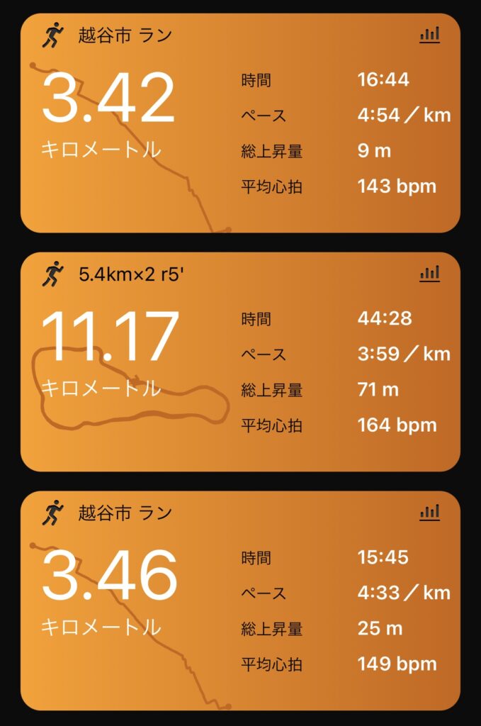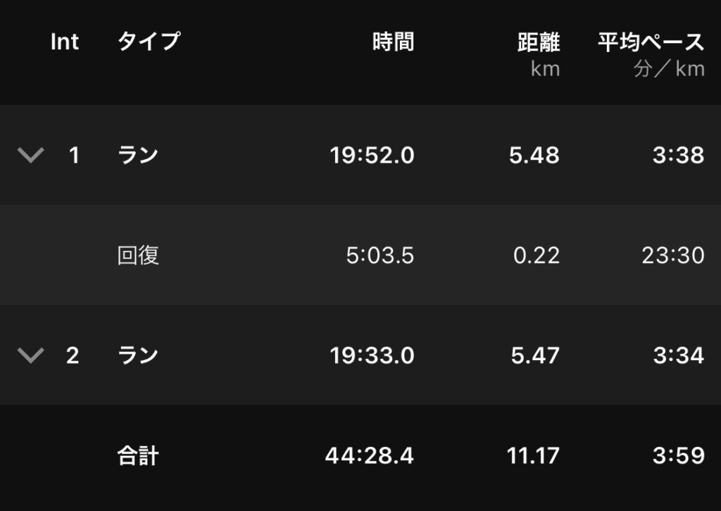 余裕を持って終えられたので2本目も欲を出さずに終えたいところだったが、3周目で突然脚が重くなってペースがガタ落ち…するギリギリのところで終わったので強度や設定はちょうどよかったのだと思う。