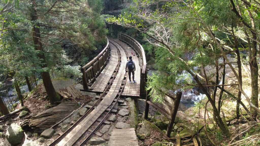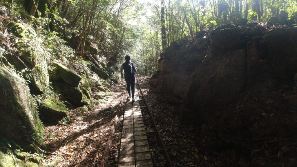 縄文杉まではここから約8kmのトロッコ道のあと2.5kmの登山道。かつては伐採した木を運搬するために使われていたが、今は観光地として各所にあるお手洗いのし尿搬出のために使われているそうな。
