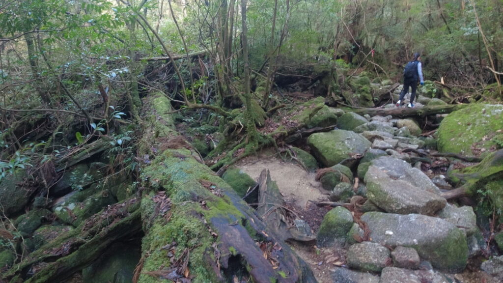 トロッコ道の終端に到達するとそこからは登山道。巨大な屋久杉がたくさん生えている森の中を進む。